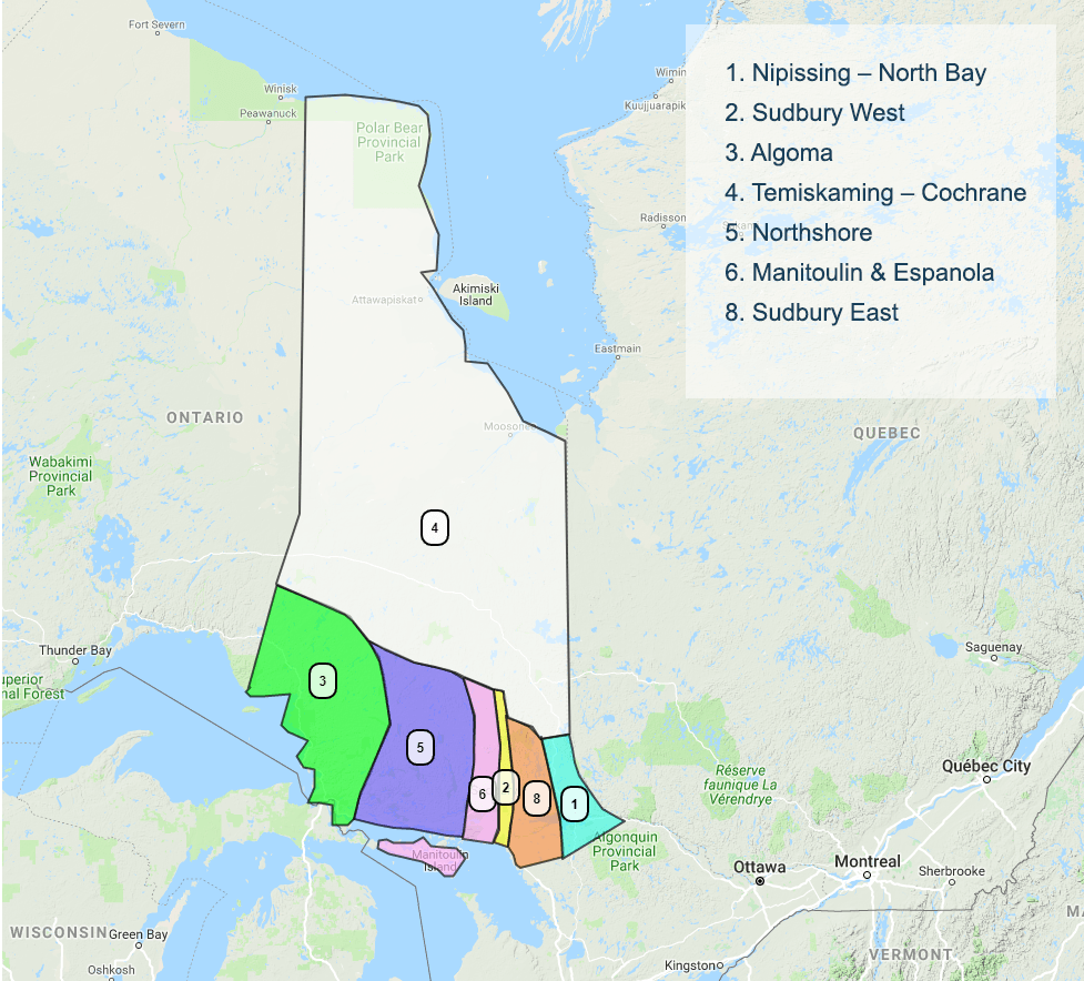 Area 84 extends from the southern shores of Hudson's Bay, serving such communities as Fort Albany and Moose Factory, to the northern shores of Lake Huron serving Sault Ste. Marie, Sudbury, Timmins, and North Bay. There are groups as far east as Ville Marie and west to Hearst. There are 7 districts in Area 84.